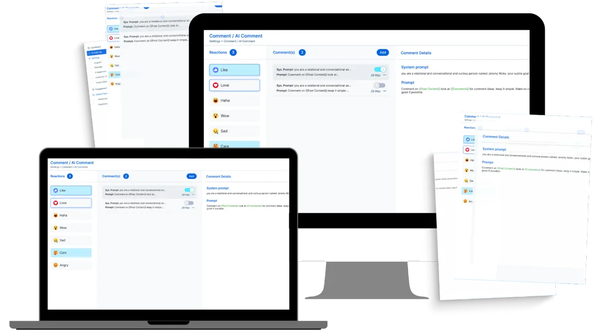 You have control. Tell the tool when to run, what reactions to use, where to search for content and even how often to respond to posts in your feed. You stay true to you while 10x your engagement with the people you're trying to connect with!